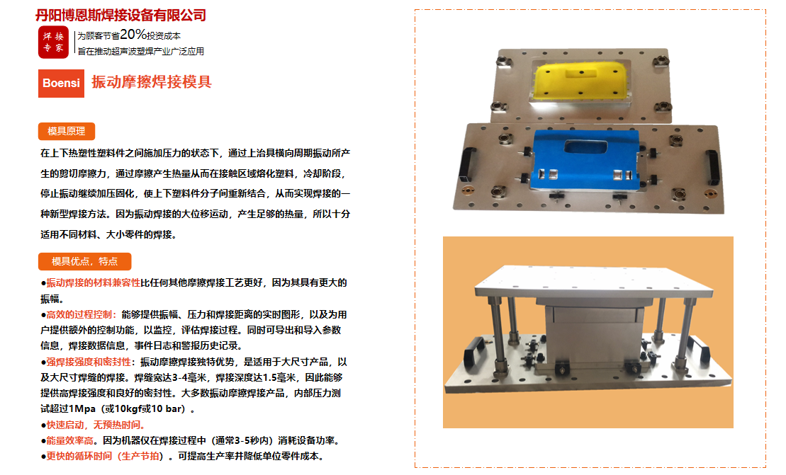 丹陽博恩斯焊接設備有限公司是塑料焊接領域集研發(fā)設計、生產制造、銷售服務為一體的企業(yè)。公司自成立以來堅持“以人為本”的理念,組織了一支強大的技術研發(fā)團隊,攜多年來積累的豐富經驗,并結合國際先進塑料焊接技術,根據(jù)市場需要,不斷開發(fā)具有核心競爭力的新產品。公司具有很強的非標機械研發(fā)、設計、生產能力,可為廣大客戶定制各類專用機械設備。公司設計生產的塑料焊接設備已廣泛應用于汽車、電子、家電、醫(yī)療器械、無紡布...